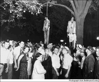 10.000 masa kulit putih nekad mengamuk dan menggelandang dua pemuda kulit hitam dari penjara, serta menghukum mereka dengan hukuman gantung tanpa keputusan hakim. Kedua pemuda ini dituduh memperkosa seorang gadis kulit putih, peristiwa terjadi di Marion-Indiana, dimana pengadilan massal sering sekali terjadi jika pelaku yang menjadi tertuduh adalah warga kulit hitam. Foto pengadilan masal seperti ini dulu sering dibuat menjadi postcard untuk menunjukkan supremasi kulit putih. Wajah mayat yang digantung berbanding kontras dengan kepuasan yang diperlihatkan warga, sebuah monumen kekejaman dan sikap barbarian…(ada yang punya foto pembakaran pencopet di jakarta nggak?)